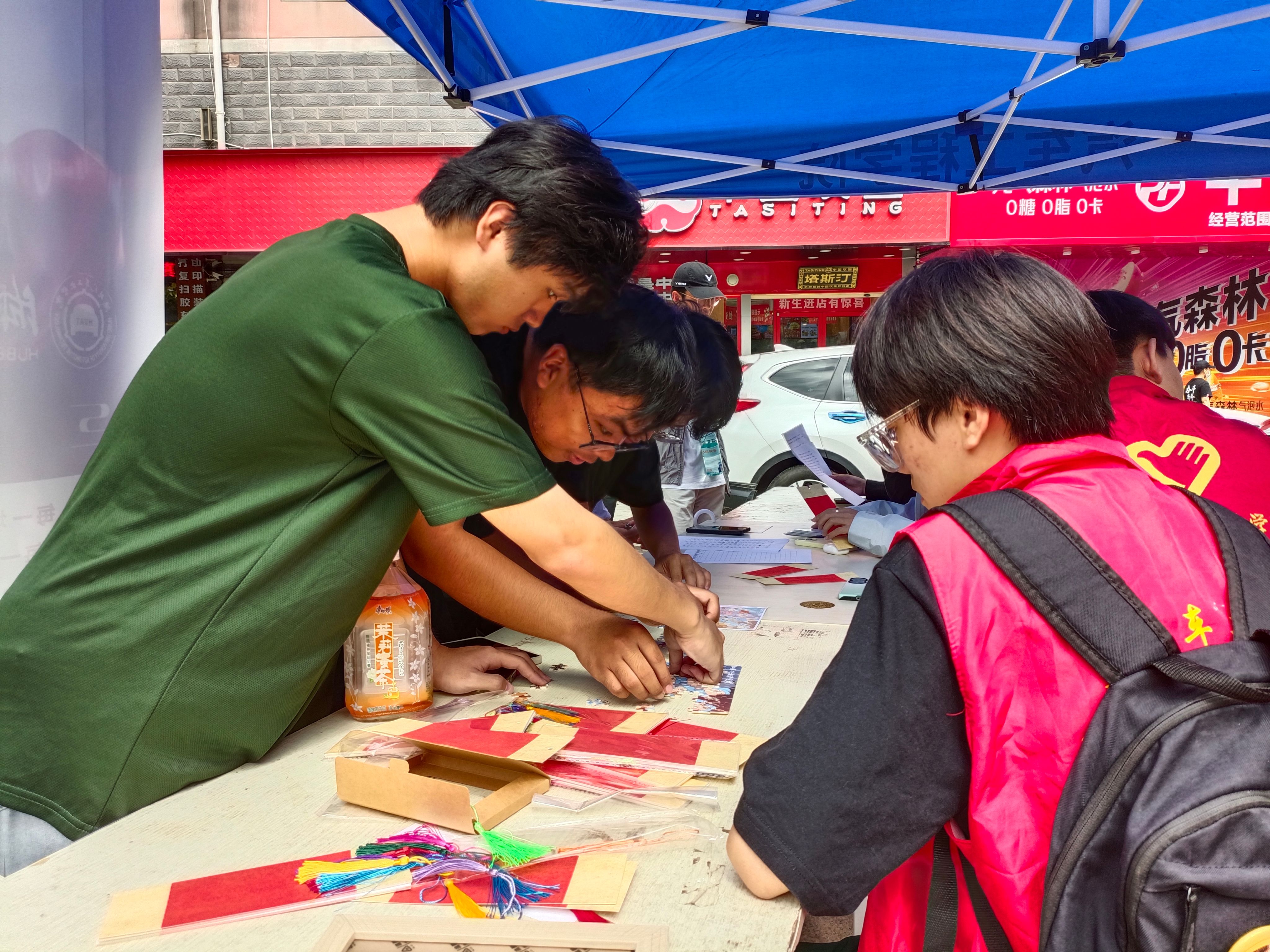 活动现场摆放着多幅拆解为碎片的红色历史拼图碎片,同学们围坐桌前,全身心投入拼图环节。拼图过程中,许多同学根据拼出的历史场景不禁述说起拼图中的红色革命故事。NEV232周逸杰感慨道:“当我把最后一块拼图嵌入画面,仿佛也把自己嵌进了那段历史,这种趣味互动的形式让红色历史“活”了起来,每一块拼图都是历史征程的微小缩影。”